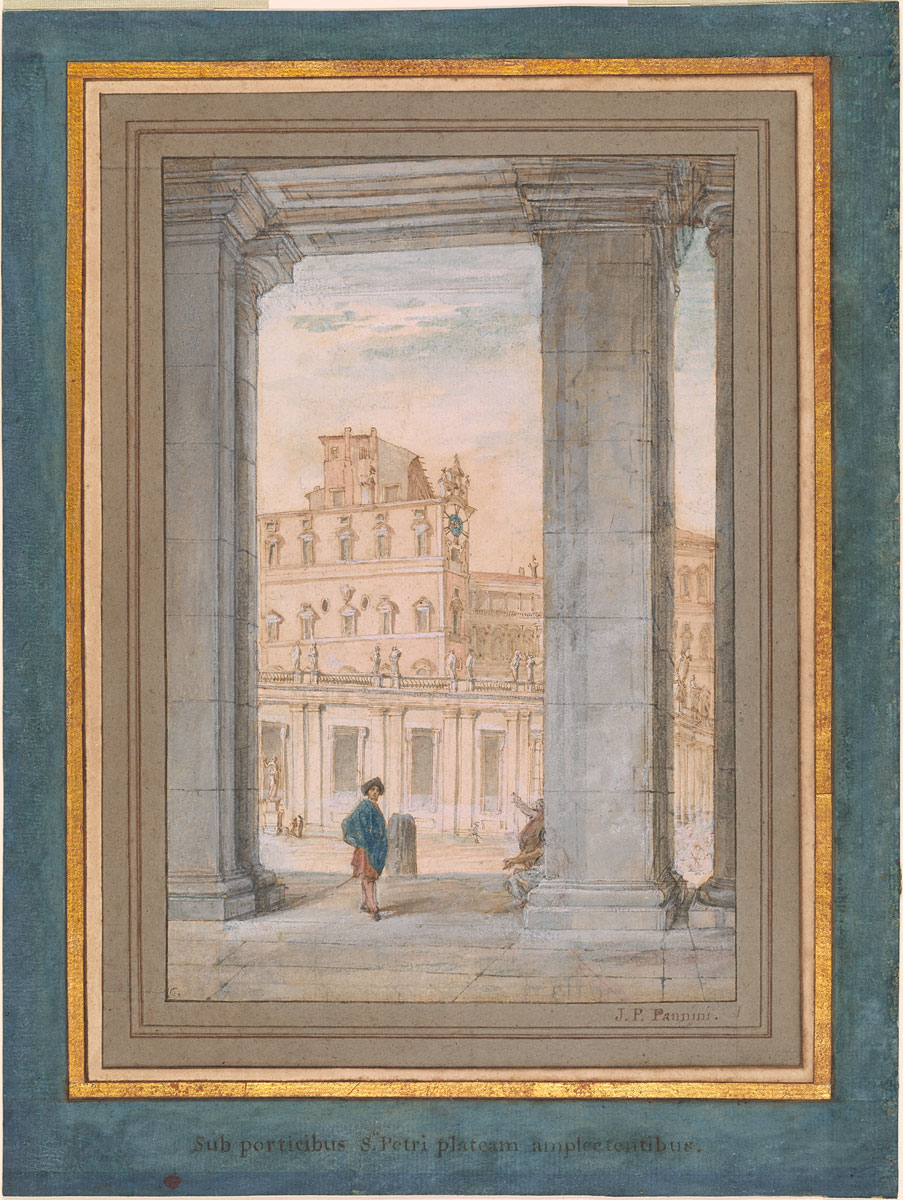 Giovanni Paolo Panini (Italian, 1691/92–1765), View of the Vatican Palace from the Colonnade of St. Peter’s, ca. 1759–62, Pen and brown ink, brush and brown wash, watercolor and white gouache, over black chalk